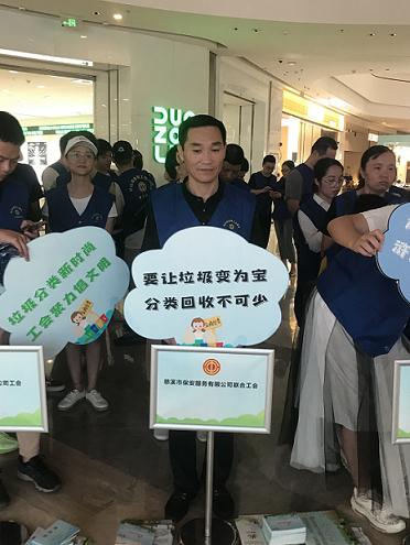 為鼓勵(lì)動(dòng)員廣大職工群眾在垃圾分類工作中發(fā)揮主力軍作用,做垃圾分類的倡導(dǎo)者、宣傳者和實(shí)施者,8月30日,慈溪市滸山街道總工會(huì)以“垃圾分類新時(shí)尚、滸山職工領(lǐng)先行”為主題,在吾悅廣場(chǎng)開(kāi)展助力垃圾分類啟動(dòng)儀式,倡導(dǎo)“我做垃圾分類好職工”。慈溪市保安服務(wù)有限公司聯(lián)合工會(huì)職工代表10人也參加了此次的啟動(dòng)儀式。